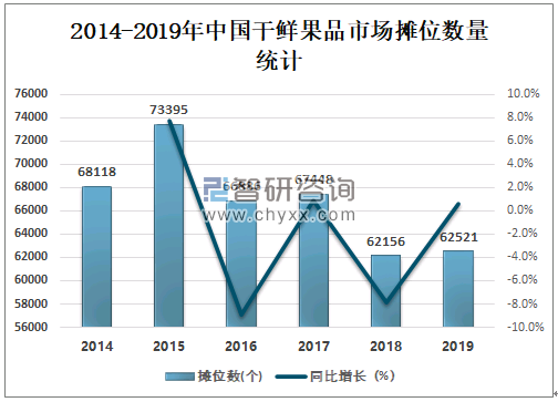 虽然2019年中国干鲜果品市场数量在减少,但摊位数量却在增加,2019年中国干鲜果品市场共有摊位62521个,较2018年增加了365个。