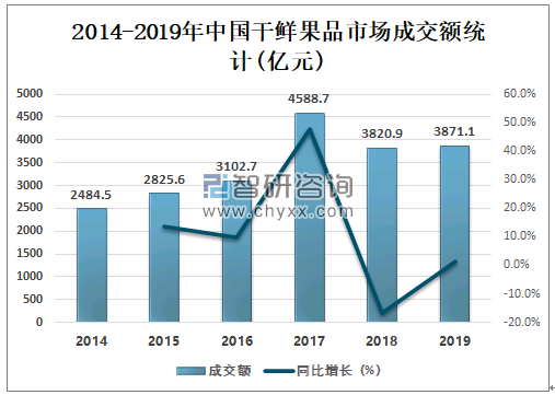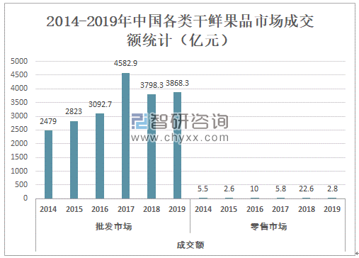 2019年中国干鲜果品批发市场成交额为3868.3亿元,较2018年增加了70亿元;2019年中国干鲜果品零售市场成交额为2.8亿元,较2018年减少了20亿元。