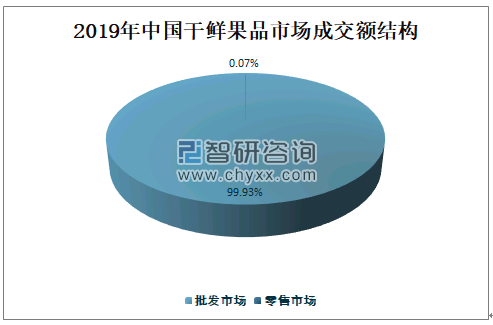 2019年中国干鲜果品批发市场成交额占总成交额的99.93%,占比非常大,是中国干鲜果品市场成交额的主要来源;零售市场成交额占总成交额的0.07%,占比非常小。