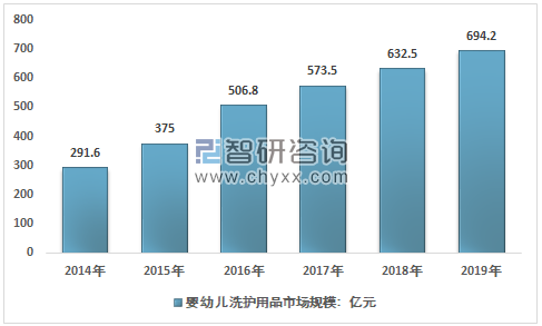 根据智研咨询发布的《2021-2027年中国婴幼儿洗护用品行业发展现状调查及竞争战略分析报告》数据显示:近几年,我国婴幼儿洗护用品行业市场规模快速增长,从2014年的291.6亿元增长到了2019年的694.2亿元。近几年我国婴幼儿洗护用品行业市场规模情况如下图所示: