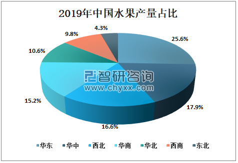 相关报告:智研咨询发布的《2021-2027年中国果汁行业市场运营态势及投资前景趋势报告》2019年,华东、华中、西北地区是中国水果产量最大的三个产区,占全国总产量的比重超过50.0%。华东水果产量占比为25.6%;华中水果产量为17.9%;西北水果产量占比为16.6%。