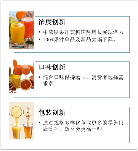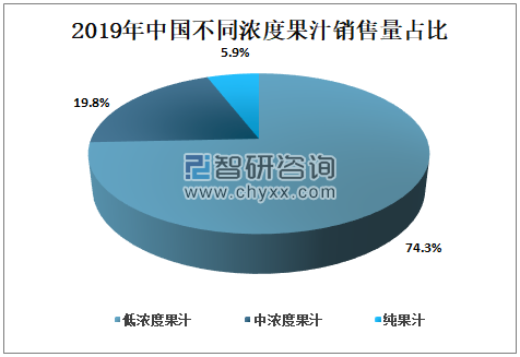 果汁方面的创新更多是一些包装和口味上的革新,创新方面如果没有更突破性的卖点,它的延续性会比较弱。其他品类在创新力度上,突破性力度是优于果汁的。2019年低浓度果汁销售量占比为74.3%;中浓度果汁销售量占比为19.8%;纯果汁销售量占比为5.9%。