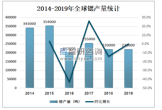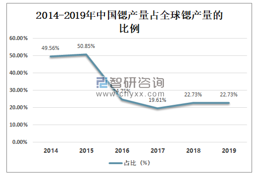 2015-2017年中国锶产量占全球锶产量的比例逐年下滑,2018年有所回升,2018年中国锶产量占全球锶产量的22.73%,较2017年增加了3.1%,2019年与2018年持平。