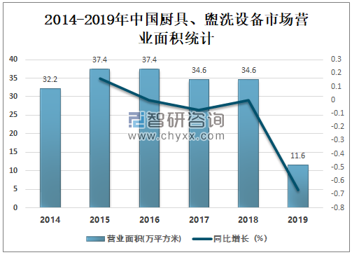 2019年中国厨具、盥洗设备市场营业面积为11.6万平方米,较2018年减少了23.02万平方米。