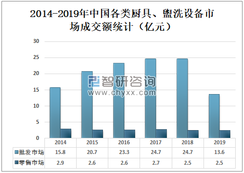 2019年中国厨具、盥洗设备批发市场成交额为13.6亿元,较2018年减少了11亿元;2019年中国厨具、盥洗设备零售市场成交额为2.5亿元,与2018年持平。