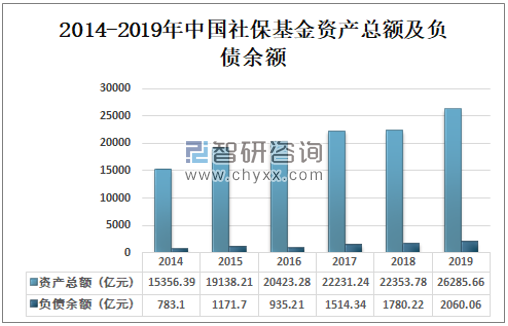 近年来,中国社保基金规模以较高的速度逐年增长。其中,养老、医疗、失业、工伤、生育5项社会保险基金收入每年递增在20%以上。2019年中国社保基金资产总额为26285.66亿元,较2018年增加了3931.88亿元;2019年中国社保基金负债余额为2060.06亿元,较2018年增加了279.84亿元。