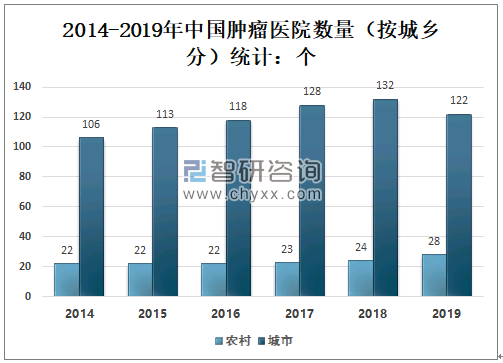 2019年中国农村共有肿瘤医院28个,较2018年增加了4个;2019年中国城市共有肿瘤医院122个,较2018年减少了10个。