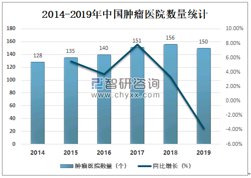 2014-2018年中国肿瘤医院数量持续增加,2018年中国共有肿瘤医院156个,较2017年增加了5个,2019年较2018年有所下滑,2019年中国共有肿瘤医院150个,较2018年减少了6个。