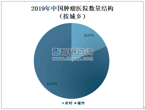 智研咨询发布的《2021-2027年中国肿瘤医院行业市场运营态势及未来发展潜力报告》数据显示:2019年中国城市肿瘤医院数量占全国肿瘤医院总数量的81.33%,占比非常大;2019年中国农村肿瘤医院数量占全国肿瘤医院总数量的18.67%,占比较小。