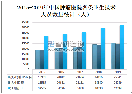2019年中国肿瘤医院共有执业(助理)医师25341人,较2018年增加了1225人;2019年中国肿瘤医院共有执业医师24789人,较2018年增加了1259人;2019年中国肿瘤医院共有注册护士42594人,较2018年增加了2564人。