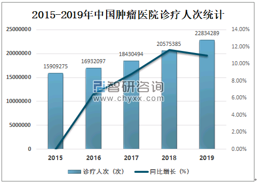 中国肿瘤医院诊疗人次持续增长,2019年中国肿瘤医院诊疗人次达22834289次,较2018年增加了2258904次,同比增长率达10.98%。