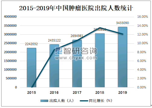 虽然中国肿瘤医院入院人数持续增长,但出院人数也在增加,2019年中国肿瘤医院出院人数达3433090人,较2018年增加了372274人,同比增长率达12.16%。