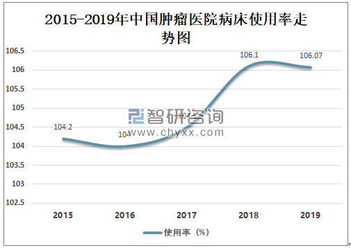 2016-2018年中国肿瘤医院病床使用率持续增长,2018年中国肿瘤医院病床使用率达106.1%,较2017年增加了1.6%,2019年较2018年有所下降,2019年中国肿瘤医院病床使用率为106.07%,较2018年减少了0.03%。