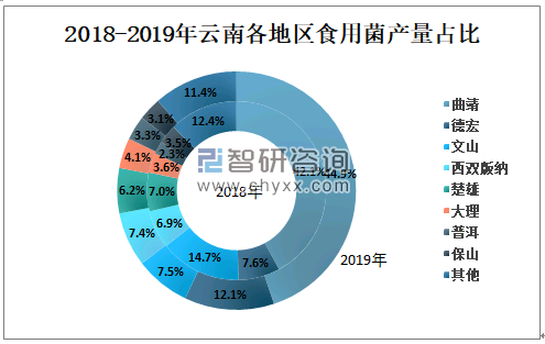 2018-2019年云南各地区食用菌产量占比