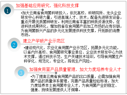 云南食用菌精深加工技术一直在低端徘徊,产品附加值低,产业链短。云南省出口食用菌形式单一,出口贸易国家定向性强,主要以新鲜食用菌为主,产后加工品类主要为干制品、速冻品,而通过延伸食用菌产业链,从事研发功能型精深加工产品的龙头企业较少,精深加工自主品牌创建仍然落后。激烈的市场竞争环境下,需要开发多形态、多类别的深加工产品,提高食用菌产后加工利用率,充分利用食用菌加工中的废料,降低市场价格波动、需求变化对云南省食用菌产业的影响,使食用菌产品朝着增值化、品牌化的方向发展。