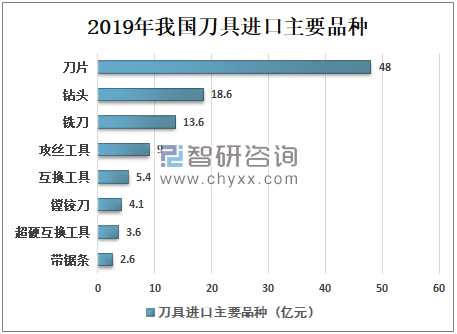 2019年我国刀具进口的主要品种有:刀片(48亿元)、钻头(18.6亿元)、铣刀(13.6亿元)、攻丝工具(9亿元)、互换工具(5.4亿元)、超硬互换工具(3.6亿元)、镗铰刀(4.1亿)、带锯条(2.6亿)。2019年硬质合金刀片进口额为44亿元人民币,是出口额(13亿元人民币)的3.4倍。