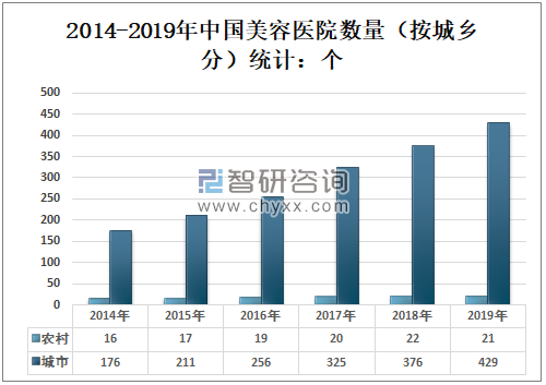智研咨询发布的《2021-2027年中国美容医院行业市场研究分析及投资前景规划报告》数据显示:2019年中国农村共有美容医院21个,较2018年减少了1个;城市共有美容医院429个,较2018年增加了53个。