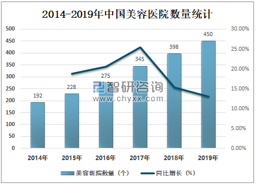 近年来中国美容医院数量持续增加,2018年中国共有美容医院398个,较2017年增加了53个;2019年中国共有美容医院450个,较2018年增加了52个。