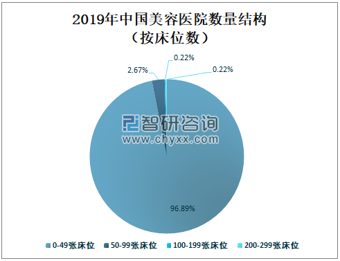 2019年拥有0-49张床位的美容医院数量占全国美容医院总数的96.89%,占比最大;拥有50-99张床位的美容医院数量占全国美容医院总数的2.67%;拥有100-199张床位的美容医院数量占全国美容医院总数的0.22%;拥有200-299张床位的美容医院数量占全国美容医院总数的0.22%。