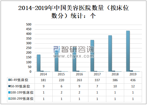 2019年拥有0-49张床位的美容医院436个,较2018年增加了50个;拥有50-99张床位的美容医院12个,较2018年增加了2个;拥有100-199张床位的美容医院1个,与2018年持平;拥有200-299张床位的美容医院1个,与2018年持平。