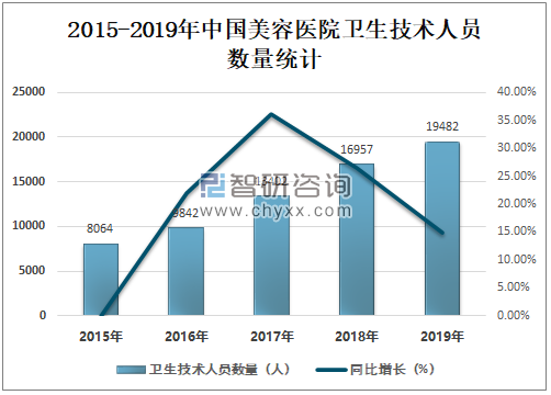 中国美容医院卫生技术人员数量持续增长,2019年中国美容医院卫生技术人员数量为19482人,较2018年增加了2525人。