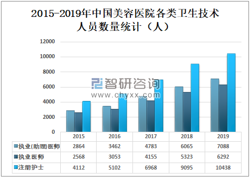 2019年中国美容医院共有执业(助理)医师7088人,较2018年增加了1023人;执业医师6292人,较2018年增加了969人;注册护士10438人,较2018年增加了1343人。