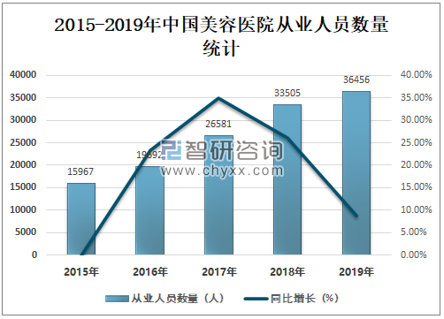 随着中国美容医院数量的增加,从业人员数量也随之增加,2019年中国美容医院从业人员数量为36456人,较2018年增加了2951人,同比增长率为8.81%。