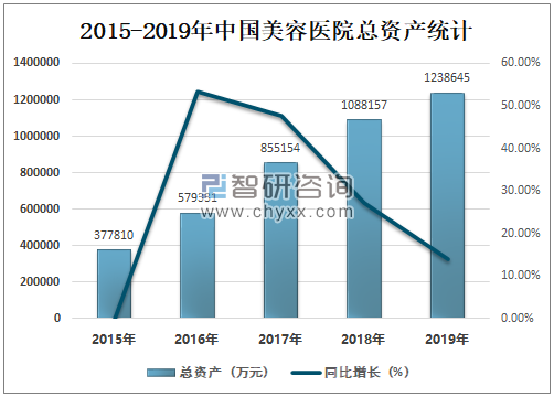中国美容医院总资产持续增长,2019年中国美容医院总资产为1238645万元,较2018年增加了150488万元,同比增长率达13.83%。