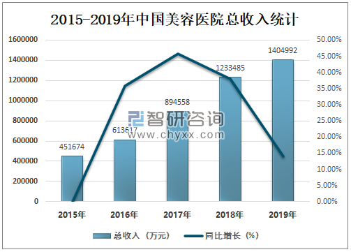 中国美容医院总收入快速增长,2019年中国美容医院总收入为1404992万元,较2018年增加了171507万元,同比增长率达13.90%。