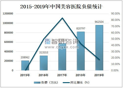 随着中国美容医院总资产增长的同时,负债也在增加,2019年中国美容医院负债为962504万元,较2018年增加了141707万元,同比增长率达17.26%。