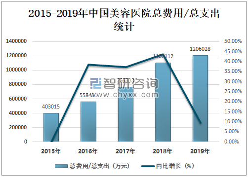 随着中国美容医院收入的增长,支出也在增加,2019年中国美容医院总费用/总支出为1206028万元,较2018年增加了105916万元,同比增长率为9.63%。