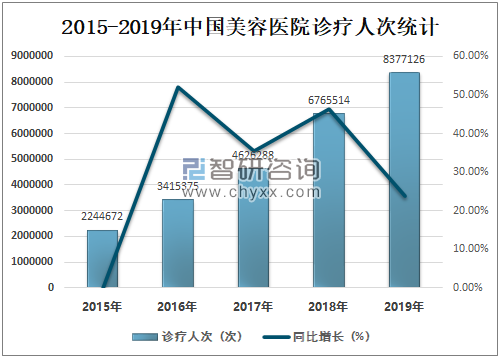 中国美容医院诊疗人次快速增长,2019年中国美容医院诊疗人次为8377126次,较2018年增加了1611612人,同比增长率达23.82%。