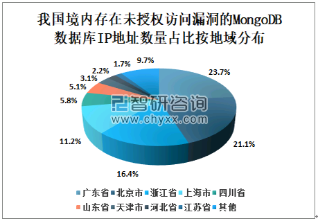 我国境内存在未授权访问漏洞的MongoDB数据库IP地址数量占比按地域分布,其中排名前3位的为广东省、北京市和浙江省。