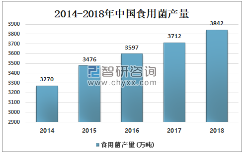 作为世界食用菌生产大国,中国不仅拥有丰富的菌品种,而且产量也相当高,目前可进行人工栽培的食用菌有 60 多种。根据中国食用菌协会数据显示:中国食用菌产量由2014年的3270万吨增加至2018年的3842万吨。