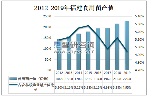 2019年福建省食用菌产值达到229.4亿元,较2018年的216.8亿元同比增长5.79%,占福建省农林牧渔业总产值的4.95%。