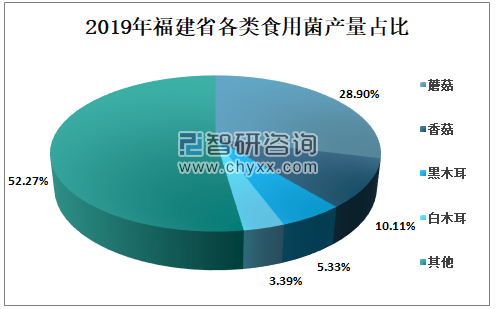 智研咨询发布的《2021-2027年中国食用菌行业市场专项调查及投资方向研究报告》数据显示:2019年福建蘑菇产量占福建食用菌产量的28.9%,香菇产量占福建食用菌产量的10.11%,黑木耳产量占福建食用菌产量的5.33%,白木耳产量占福建食用菌产量的3.39%。