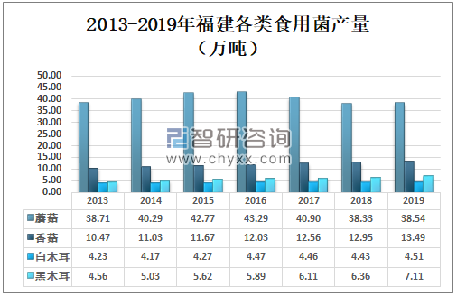2019年福建蘑菇产量为38.54万吨,较2018年增加了0.21万吨;福建香菇产量为13.49万吨,较2018年减少了0.54万吨;福建白木耳产量为4.51万吨,较2018年增加了0.08万吨;福建黑木耳产量为7.11万吨,较2018年增加了0.75万吨。