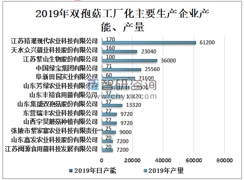 国内工厂化双孢蘑菇日产能超过50吨的企业有5家,其中,江苏裕灌2019年底双孢蘑菇日产能170吨,众兴菌业2019年底双孢蘑菇日产能160吨,紫山生物2019年底双孢蘑菇日产能100吨,绿宝集团2019年底双孢蘑菇日产能71吨,阜新田园2019年底双孢蘑菇日产能60吨。