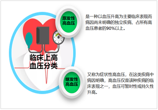 高血压(hypertension)是指以体循环动脉血压(收缩压和/或舒张压)增高为主要特征(收缩压≥140毫米汞柱,舒张压≥90毫米汞柱),可伴有心、脑、肾等器官的功能或器质性损害的临床综合征。高血压是最常见的慢性病,也是心脑血管病最主要的危险因素。正常人的血压随内外环境变化在一定范围内波动。在整体人群,血压水平随年龄逐渐升高,以收缩压更为明显,但50岁后舒张压呈现下降趋势,脉压也随之加大。近年来,人们对心血管病多重危险因素的作用以及心、脑、肾靶器官保护的认识不断深入,高血压的诊断标准也在不断调整,目前认为同一血压水平的患者发生心血管病的危险不同,因此有了血压分层的概念,即发生心血管病危险度不同的患者,适宜血压水平应有不同。血压值和危险因素评估是诊断和制定高血压治疗方案的主要依据,不同患者高血压管理的目标不同,医生面对患者时在参考标准的基础上,根据其具体情况判断该患者最合适的血压范围,采用针对性的治疗措施。在改善生活方式的基础上,推荐使用24小时长效降压药物控制血压。除评估诊室血压外,患者还应注意家庭清晨血压的监测和管理,以控制血压,降低心脑血管事件的发生率。临床上高血压可分为两类: