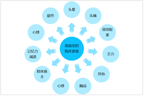 高血压的症状因人而异。早期可能无症状或症状不明显,常见的是头晕、头痛、颈项板紧、疲劳、心悸等。仅仅会在劳累、精神紧张、情绪波动后发生血压升高,并在休息后恢复正常。随着病程延长,血压明显的持续升高,逐渐会出现各种症状。此时被称为缓进型高血压病。缓进型高血压病常见的临床症状有头痛、头晕、注意力不集中、记忆力减退、肢体麻木、夜尿增多、心悸、胸闷、乏力等。高血压的症状与血压水平有一定关联,多数症状在紧张或劳累后可加重,清晨活动后血压可迅速升高,出现清晨高血压,导致心脑血管事件多发生在清晨。