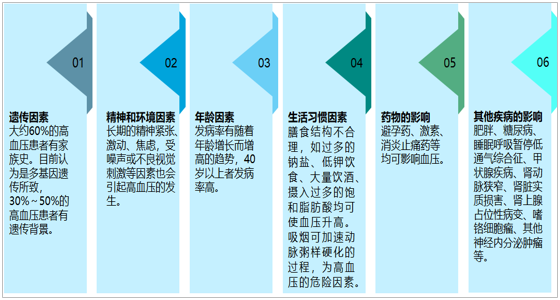 高血压的病因主要有:1.遗传因素:大约60%的高血压患者有家族史。目前认为是多基因遗传所致,30%~50%的高血压患者有遗传背景。2.精神和环境因素:长期的精神紧张、激动、焦虑,受噪声或不良视觉刺激等因素也会引起高血压的发生。3.年龄因素:发病率有随着年龄增长而增高的趋势,40岁以上者发病率高。4.生活习惯因素:膳食结构不合理,如过多的钠盐、低钾饮食、大量饮酒、摄入过多的饱和脂肪酸均可使血压升高。吸烟可加速动脉粥样硬化的过程,为高血压的危险因素。5.药物的影响:避孕药、激素、消炎止痛药等均可影响血压。6.其他疾病的影响:肥胖、糖尿病、睡眠呼吸暂停低通气综合征、甲状腺疾病、肾动脉狭窄、肾脏实质损害、肾上腺占位性病变、嗜铬细胞瘤、其他神经内分泌肿瘤等。