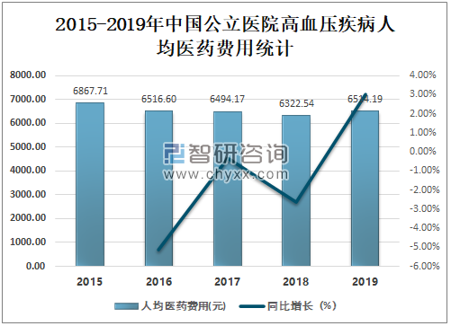 2019年中国公立医院高血压疾病人均医药费用为6514.19元,较2018年增加了191.65元,同比增长3.03%。