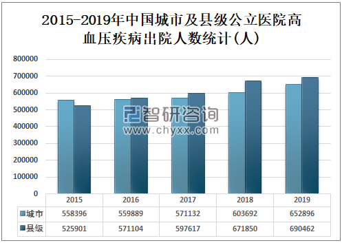2019年中国城市公立医院高血压疾病出院人数为652896人,较2018年增加了49204人;2019年中国县级公立医院高血压疾病出院人数为690462人,较2018年增加了18612人。
