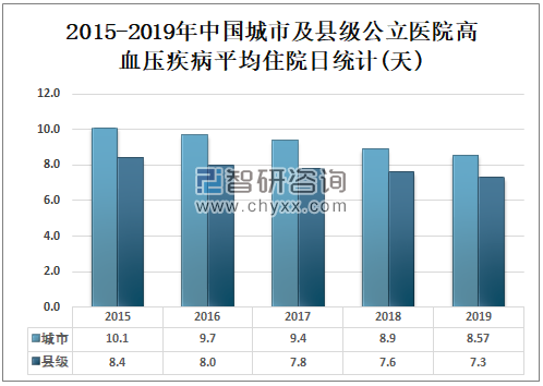 2019年中国城市公立医院高血压疾病平均住院日为8.57天,较2018年减少了0.3天;2019年中国县级公立医院高血压疾病平均住院日为7.3天,较2018年减少了0.3天。