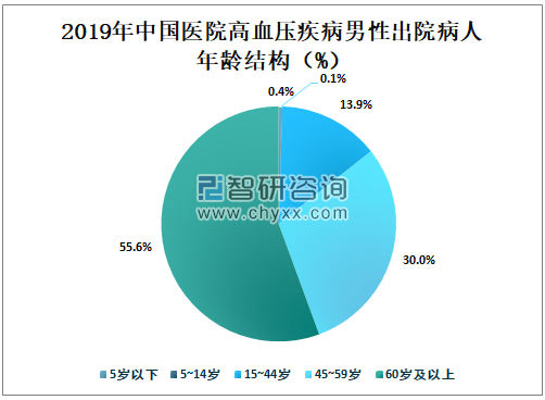 2019年中国医院60岁及以上高血压疾病(男性)出院病人占全国高血压疾病总出院病人的55.6%,占比最大;45~59岁高血压疾病(男性)出院病人占全国高血压疾病总出院病人的30.0%;15~44岁高血压疾病(男性)出院病人占全国高血压疾病总出院病人的13.9%;5岁以下高血压疾病(男性)出院病人占全国高血压疾病总出院病人的0.4%;5~14岁高血压疾病(男性)出院病人占全国高血压疾病总出院病人的0.1%。
