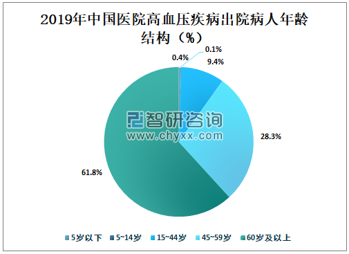 近年来,随着人们生活水平的不断提高,人们的生活习惯和饮食习惯发生了巨大的变化,导致高血压患者越来越趋于年轻化,其发病范围越来越广。2019年中国医院60岁及以上高血压疾病出院病人占全国高血压疾病总出院病人的61.8%,占比最大;45~59岁高血压疾病出院病人占全国高血压疾病总出院病人的28.3%;15~44岁高血压疾病出院病人占全国高血压疾病总出院病人的9.4%;5岁以下高血压疾病出院病人占全国高血压疾病总出院病人的0.4%;5~14岁高血压疾病出院病人占全国高血压疾病总出院病人的0.1%。