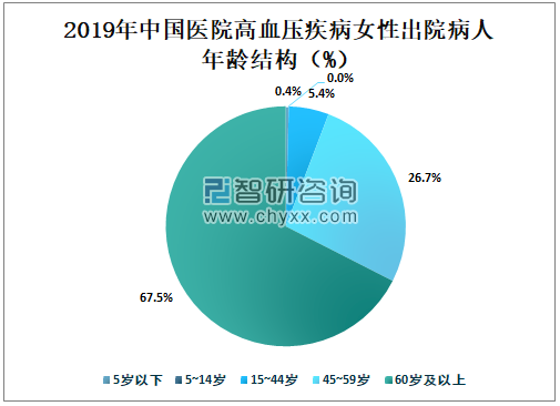 2019年中国医院60岁及以上高血压疾病(女性)出院病人占全国高血压疾病总出院病人的67.5%,占比最大;45~59岁高血压疾病(女性)出院病人占全国高血压疾病总出院病人的26.7%;15~44岁高血压疾病(女性)出院病人占全国高血压疾病总出院病人的5.4%;5岁以下高血压疾病(女性)出院病人占全国高血压疾病总出院病人的0.4%。