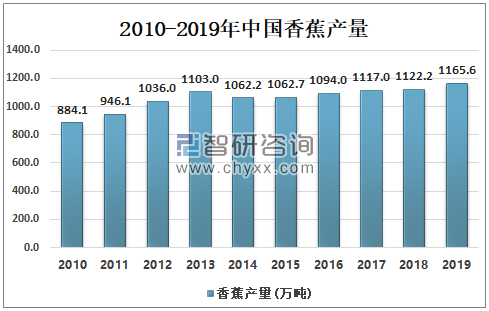 中国是世界第三大香蕉生产国,香蕉产业在热区经济和农村社会发展中发挥着越来越重要的作用,2014年以来,中国香蕉产量保持小幅度增长,2019年中国香蕉产量达到1165.6万吨,较2018年增加了43.4万吨。