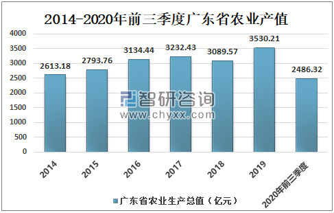 改革开放以来,广东农业与农村社会经济发生了显著的变化。农业生产总值整体呈上升趋势,农民生活水平明显改善。2019年广东农业产值为3530.21亿元,较2018年同比增长14.26%,2020年前三季度广东农业产值为2486.32亿元。
