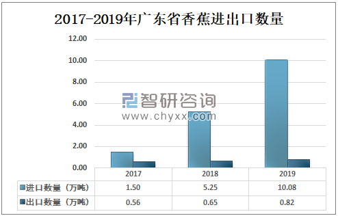 香蕉是世界上进出口贸易销量最大的水果,年交易量居各类水果之首。2018年广东省香蕉进口数量为5.25万吨,出口数量为0.65万吨;2019年广东省香蕉进口数量为10.08万吨,出口数量为0.82万吨。